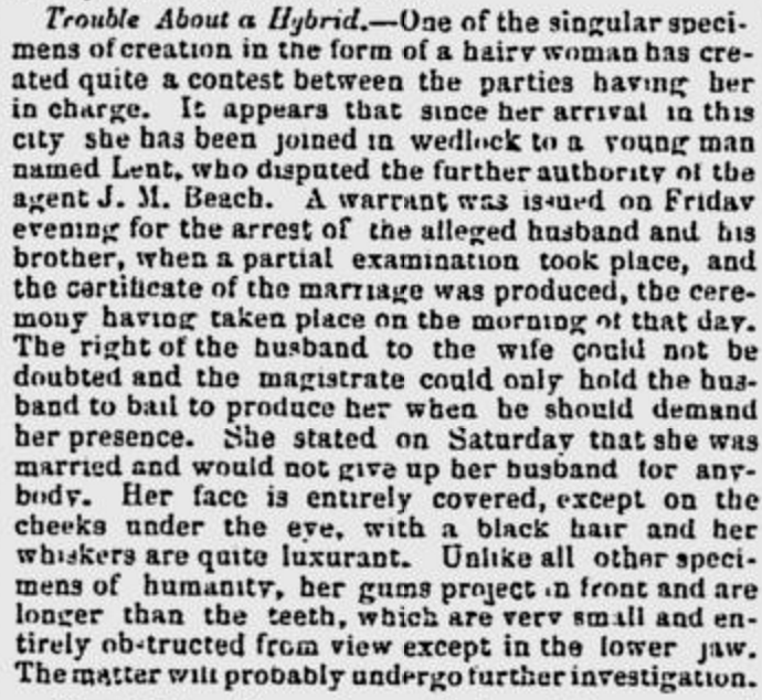 The young man exhibited a certificate of marriage with the hideous monster!… [they] came out in toe county early in the morning to have the knot tied! She refused to raise her veil during the ceremony and when over, she gave the clergyman a sight of her visage… were we the judge we should order that the young man, as a punishment for his unnatural marriage, should be forced to live with his wife until death, passed then. It would be awful!